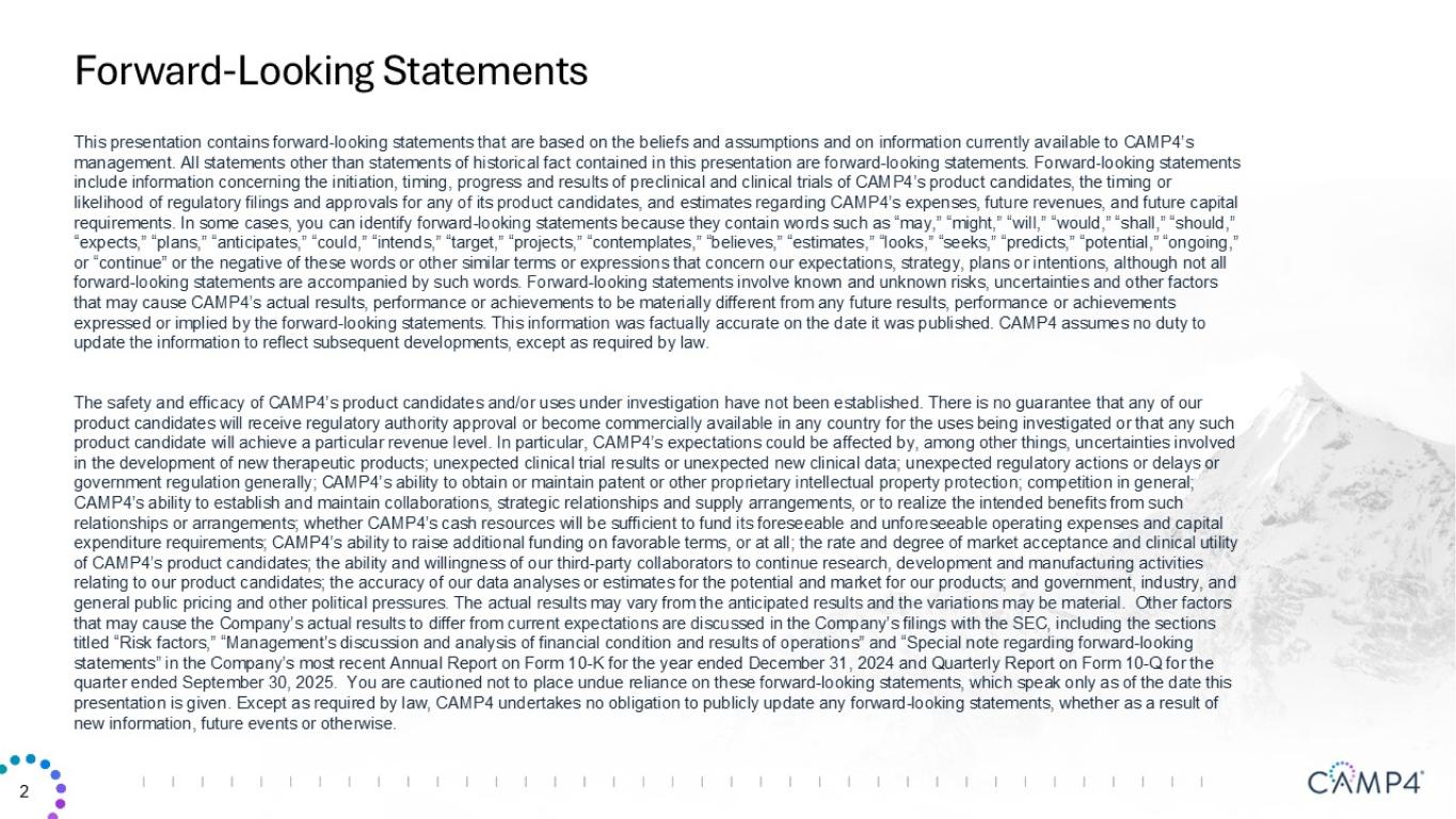 From time to time, CAMP4 Therapeutics Corporation (the “Company”) presents and/or distributes slides and presentations to the investment community to provide updates and summaries of its business. On January 9, 2026, the Company updated its corporate presentation, which is available on the “Investors” section of the Company’s website at https://investors.camp4tx.com. This presentation is also furnished as Exhibit 99.1 to this Current Report on Form 8-K.
